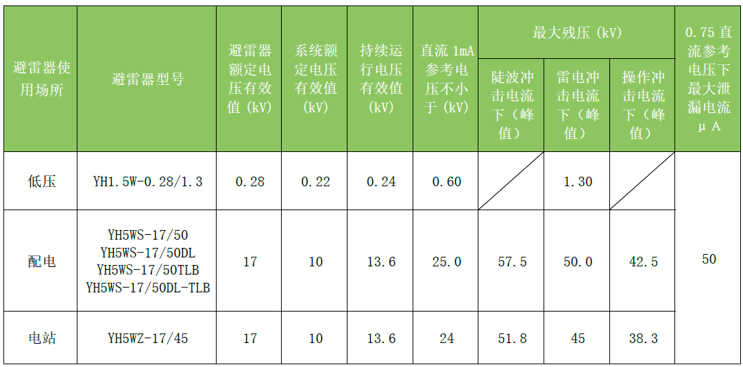 执行标准:GB/T 11032《交流无间隙金属氧化物避雷器》、GB/T 32520《交流1kV 以上架空输电和配电线路用带外串联间隙金属氧化物避雷器》